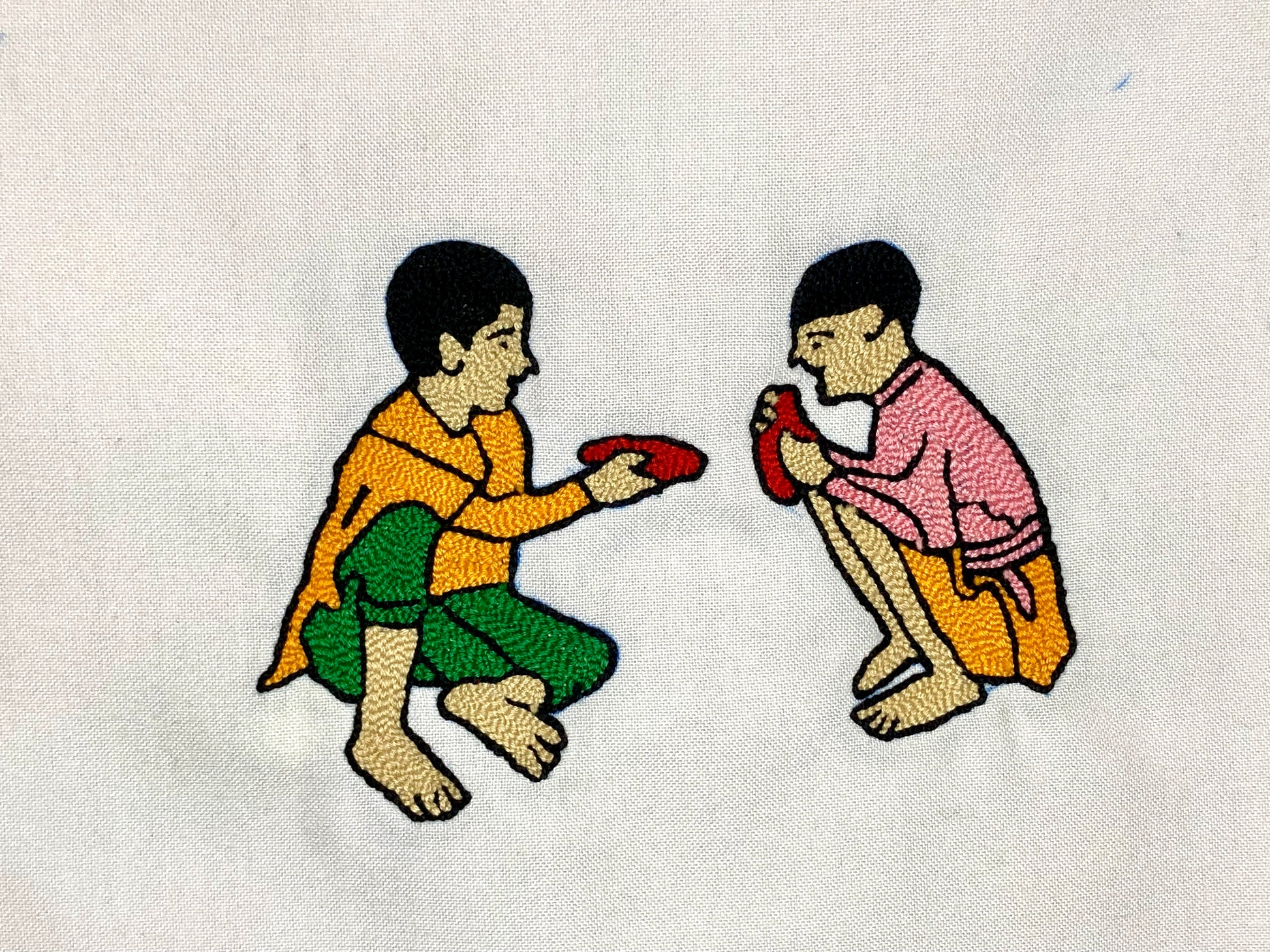 It is traditional in the culture of the Tharu indigenous people for the families to meet after a wedding at a ceremony known as Samdini Dhog. These two fathers are eating roti at the home of the bride’s parents.