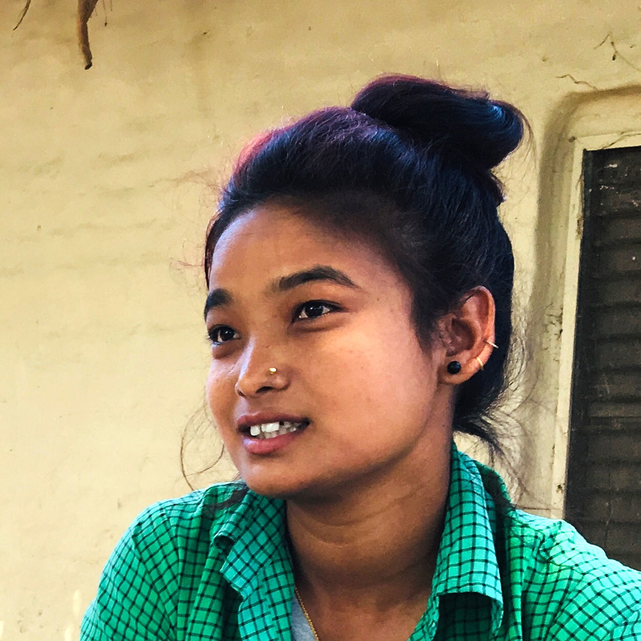 This green-eyed tiger was embroidered by Kanchan Chaudhary in Bardiya, Central Nepal, in honor of tigers that live in a nearby National Park. Kanchan then made the tote bag, and added the tiger and green stripes. She has placed her woven signature bottom right.